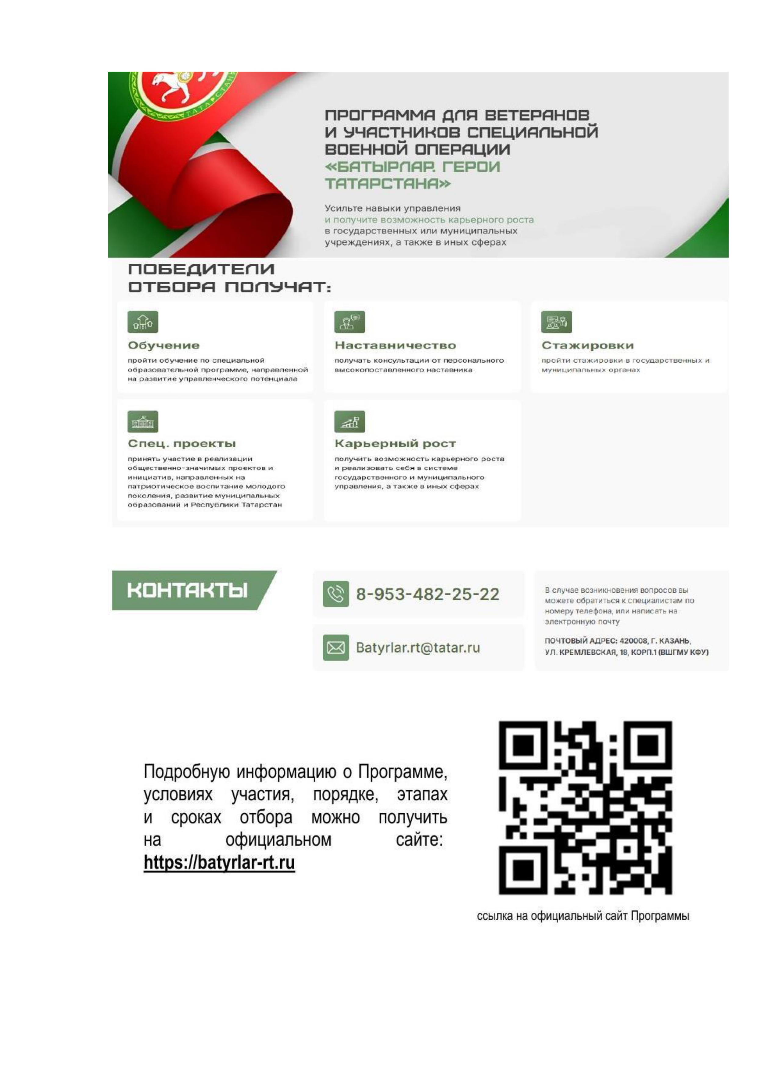 Рустам Минниханов запустил кадровый проект «Батырлар — герои Татарстана». Это аналог федеральной программы «Время героев», реализуемой по поручению президента РФ. Цель проекта — подготовка руководителей из числа участников СВО для последующей работы в органах власти и госкомпаниях.